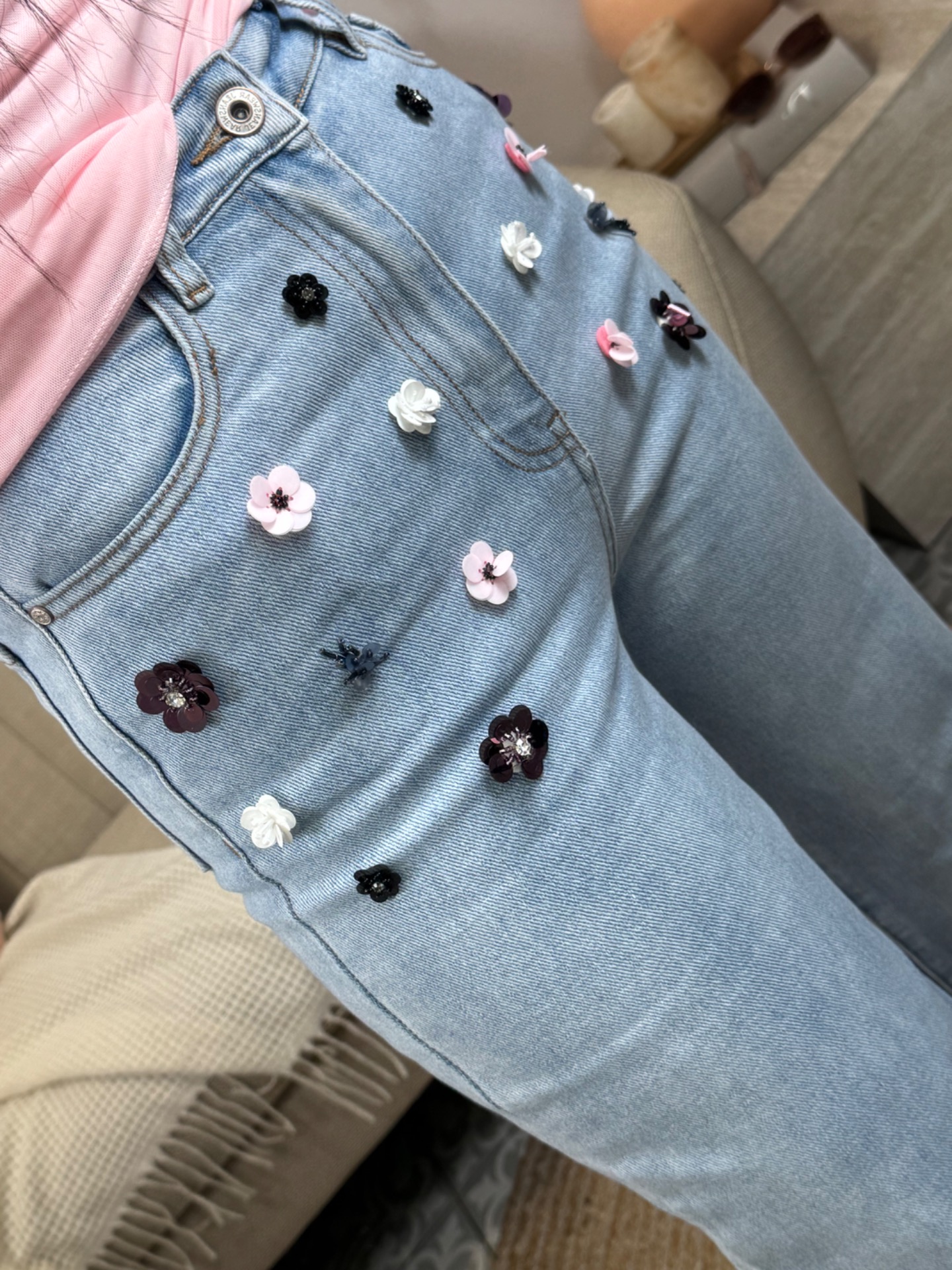 Jeans met 3D bloementjes. maten vallen klein uit. Je kan best een maatje groter nemen. geen stretch.