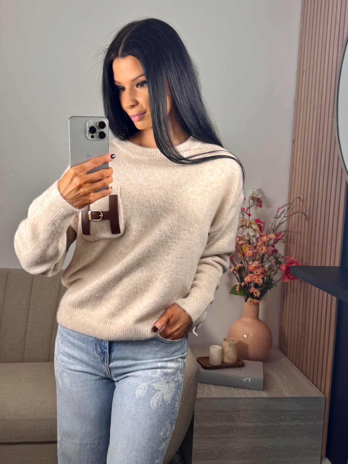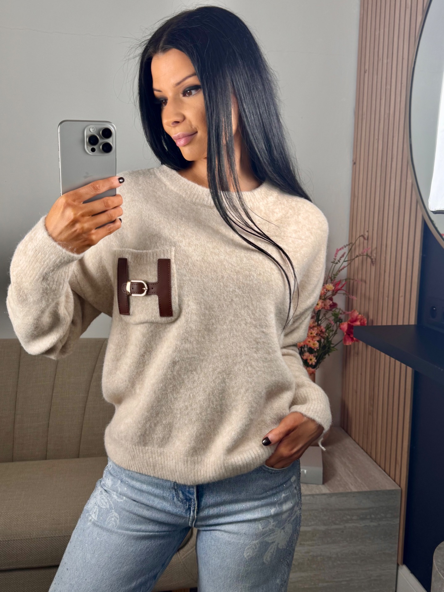 warme trui met H detail. 10% wol. TU past tot maat 44.