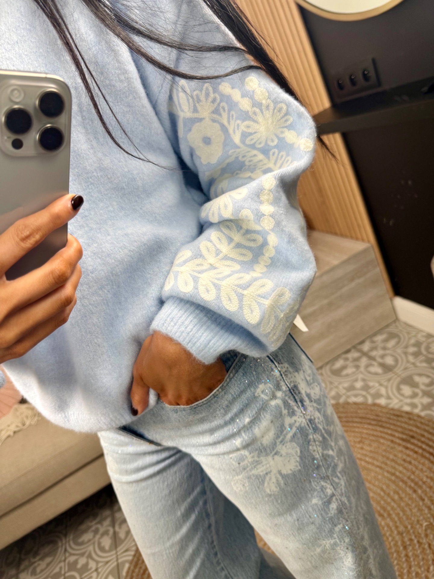 warme knit met mouw details. 10% wol. prikt niet. past tot paat 44.