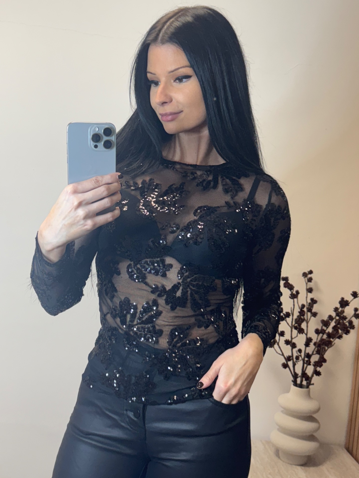 mesh top met een mooie sparkle met pailletjes. TU valt klein uit past tot een kleine 38. super mooi om samen te dragen met basic zina pull.