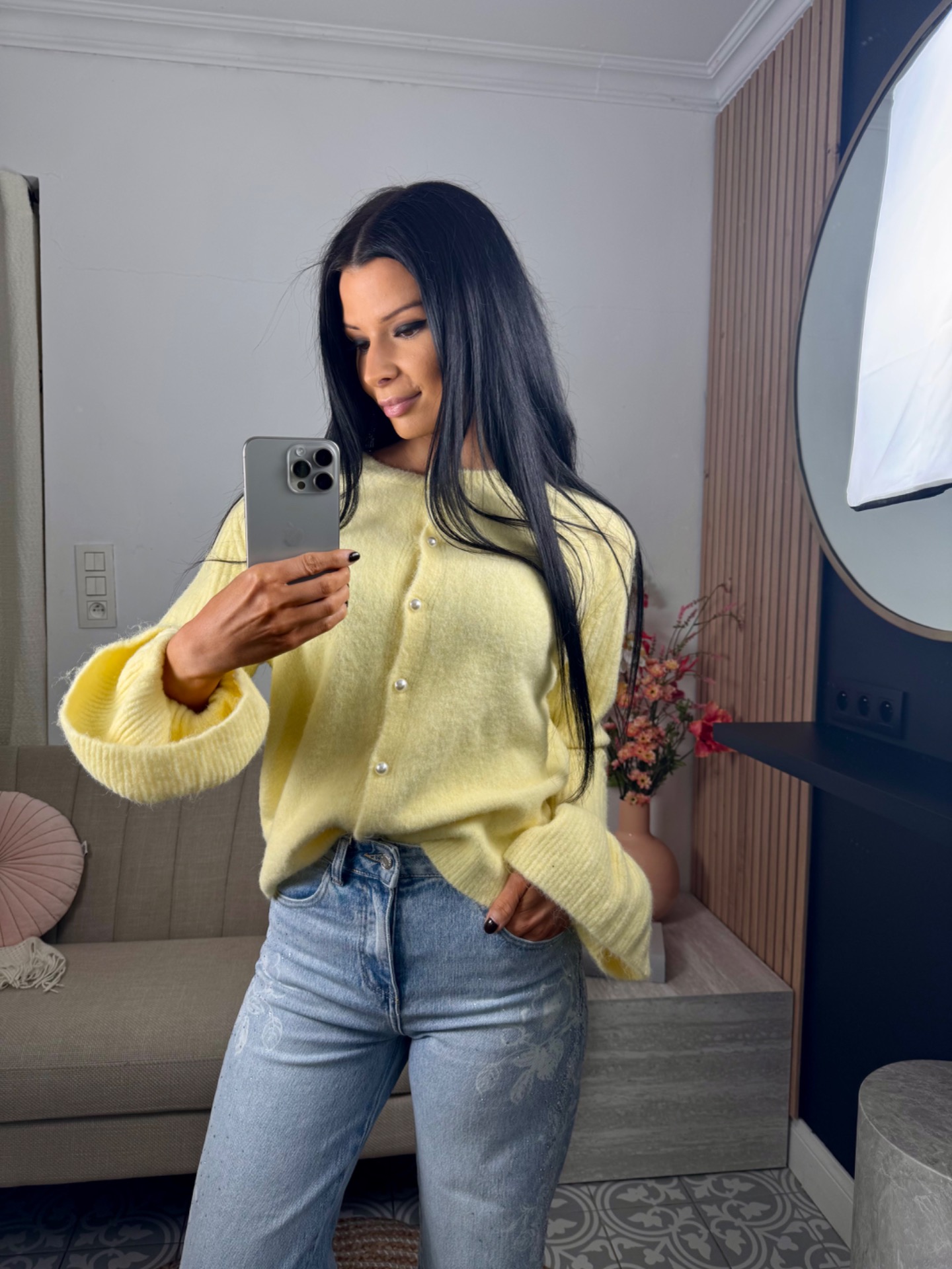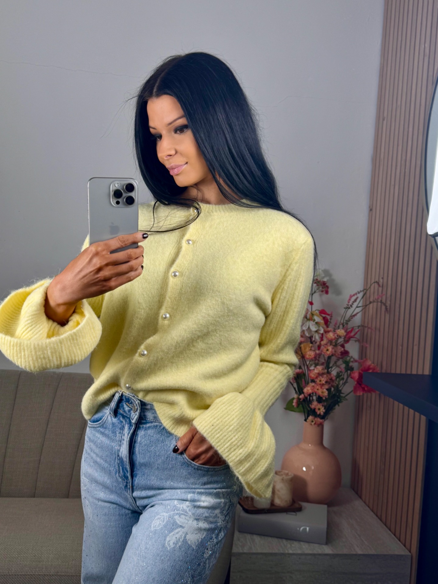 zachte cardigan met parel knopjes. TU past tot maat 40. 10% wol. prikt niet.