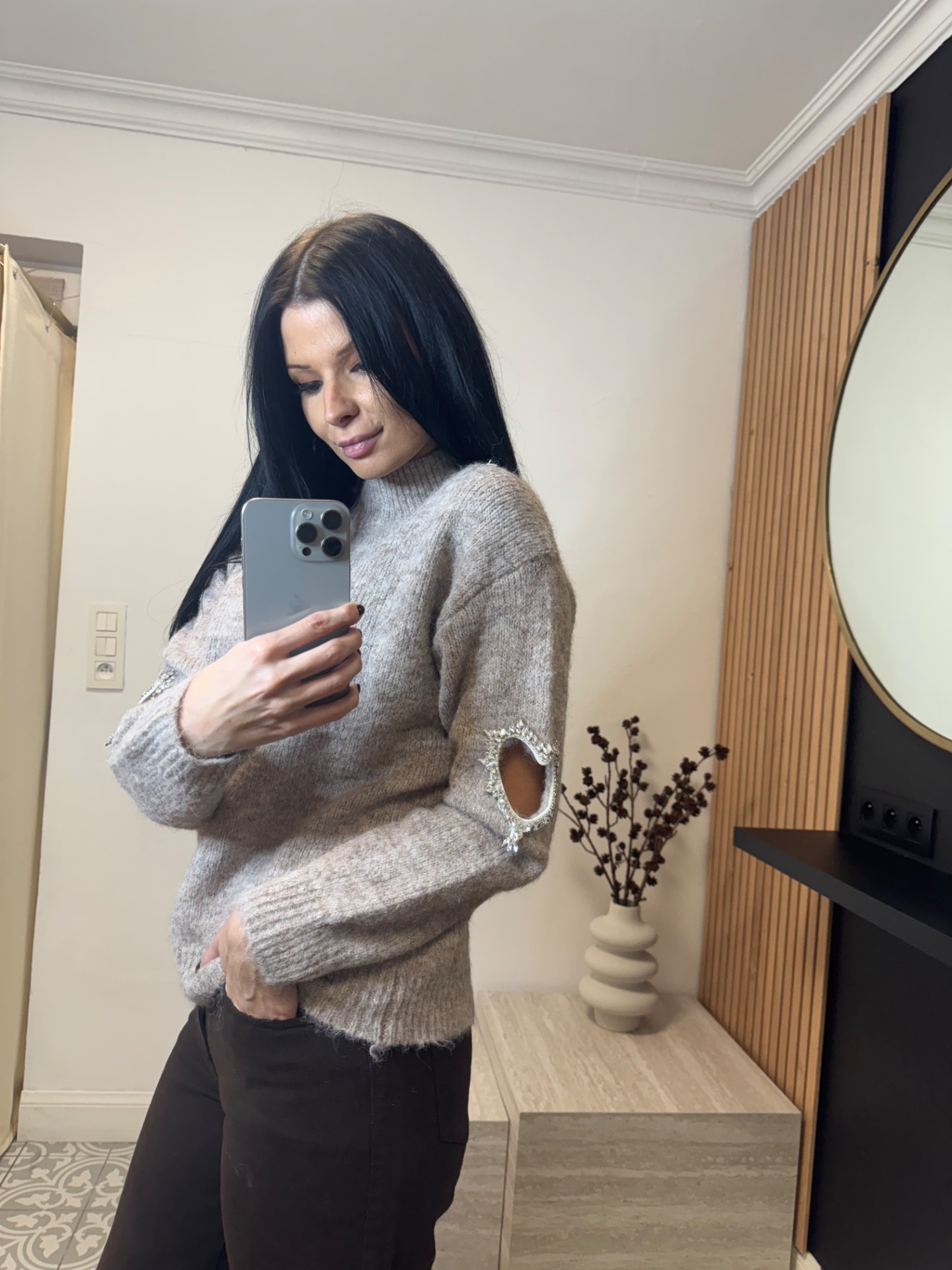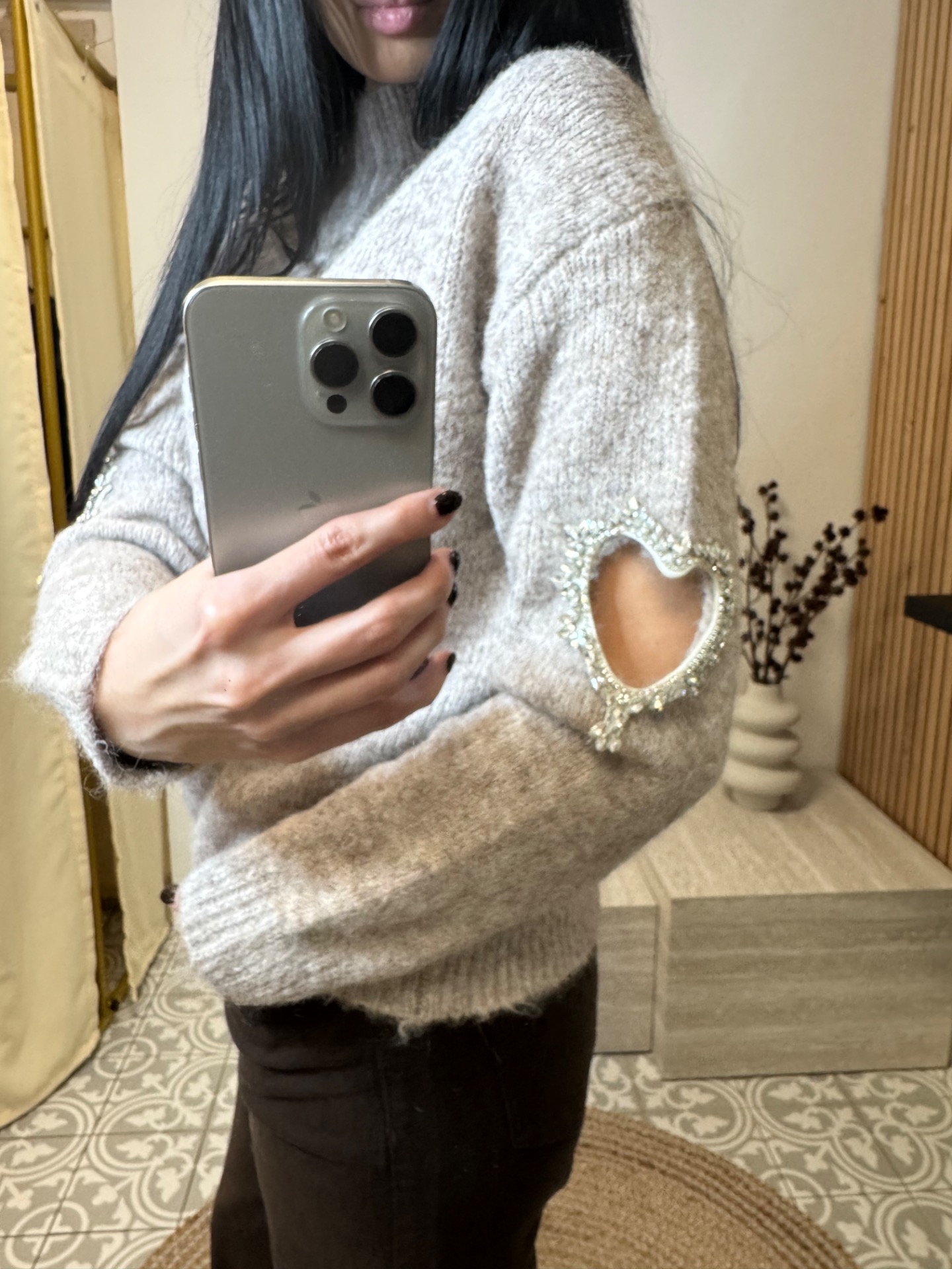 Taupe trui met een schattig hartje op de mouw. Heerlijk zacht, makkelijk te combineren en perfect voor elke dag. S/M past tot 38. M/L tot 42.